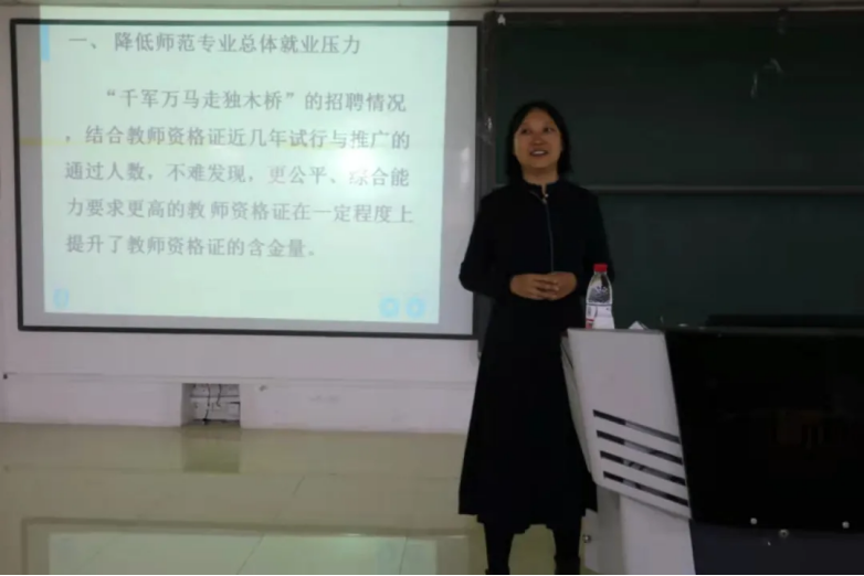 王晓璐从降低师范专业总体就业压力和推动师范教育专业课程与教学改革两个方面展开讲解。她表示,师范专业毕业学生的总体竞争压力将实现一定程度下降,毕业证和教师资格证在学生就业过程中也将发挥更为有力的作用,这对于我国教育事业的规范化发展、教师素质的整体提升都将带来较为积极影响。2016~2019年,教师资格证的持有人数与招生规模人数的比例就将处于不断下降趋势,教师资格证含金量的上升趋势由此也能够实现。