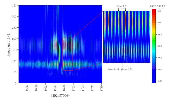 图 1 光变曲线的小波分析图,颜色代表了QPO的信号强度。