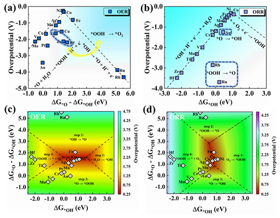 图2:基于高通量计算得出的电催化析氧,电催化还原氧的火山图和等高线图。