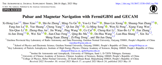 近日,必一体育·(中国)官方网站肖硕博士等在国际知名天文学领域1区TOP期刊The Astrophysical Journal Supplement Series (IF=9.2)在线发表题为“Pulsar and Magnetar Navigation with Fermi/GBM and GECAM”的研究论文。