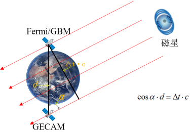 此外,该研究还提出了一种利用宇宙中重复爆发,基于三角定位原理逆过程的导航新方法,并通过李惕碚院士等人提出的Li-CCF方法,计算不同位置探测器观测到爆发的时间差。通过我国“极目”卫星(GECAM)和美国Fermi卫星联合观测磁星SGR J1935+2154的20多次重复爆发,成功验证了该方法。审稿人评价其方法非常有趣,该研究为深空探测及航天器自主定位提供了新思路。
