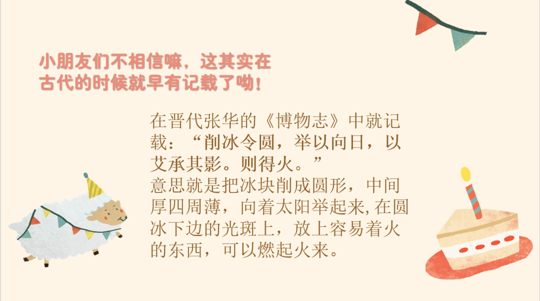 思柳老师以一首大家耳熟能详的《静夜思》开篇,由此引申出一个关于“光”的小问题——用冰可以借助太阳光取火吗?