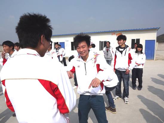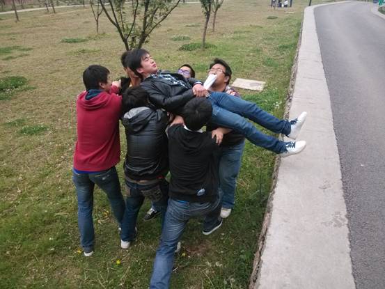 ③答题环节:7个小组依次围成一个圆,两名主持人在圈内念题。依次作答,错题数先到7题的5个小组接受惩罚(惩罚的形式由背摔、体力锻炼和神秘惩罚组成);