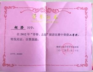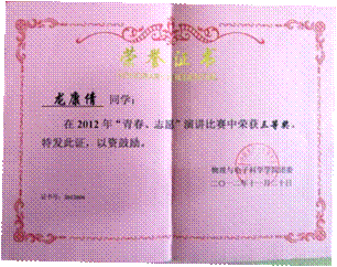 胡澄、龙康倩同学 在2012年“青春·志愿”演讲比赛中分别荣获二等奖、三等奖。