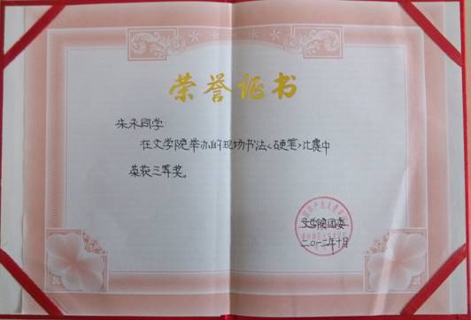 朱永同学在文学院举办的现场书法<硬笔>比赛中荣获三等奖。