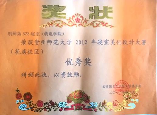 明辨苑2栋523寝室(李莎.倪长艳.王静.陈李风同学)荣获贵州师范大学2012年寝室美化设计大赛(花溪校区)优秀奖。