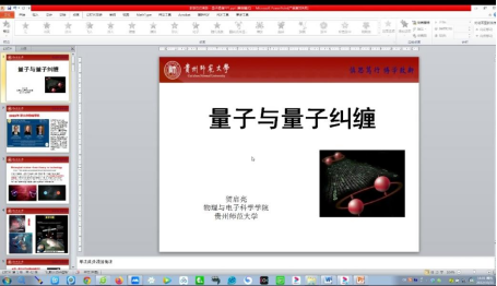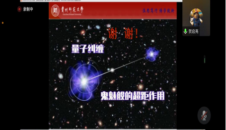 会议中,贺教授具体从量子纠缠产生的背景、量子纠缠与Bell不等式、Bell实验以及量子隐形传态四个方面介绍了量子与量子纠缠,并跟同学们分享了“幽灵般的超距作用”、科学大片中“瞬间转移”这些令人费解的神奇思想背后蕴藏的物理学原理,给在场的老师和同学们开启了颠覆常识的旅程。