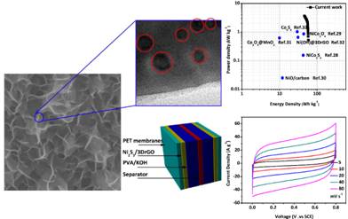 超级电容器存储能量的方式主要依赖于电解质离子在电极材料表面发生的物理吸附/氧化还原反应。因此提高超级电容的性能一方面需增大电解质和电极材料的接触面积,另一方面要提高电极材料的导电性。为了解决上述两个关键问题,该研究小组研究设计了一种基于优异导电性能的三维石墨烯和超高电容量的Ni3S2的多孔纳米复合结构(Ni3S2/3DrGO),在分子/原子层面实现了协同增强复合纳米材料的动力学参数和电容性能。基于Ni3S2/3DrGO的全固态超级电容器由于合理的结构特征和优异的导电性能,表现出了超高的能量密度(58.9 Wh kg-1)、功率密度(3.7 Kw kg-1)和优异的循环稳定性(在电流密度为10 A g-1条件下,经历30 000次循环充放电测试能保持其92%的电容量)。