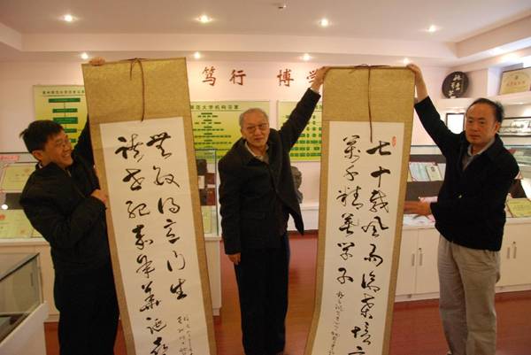 2012年4月17日上午,我校原物理系60年代校友庞守中、沈力光、李可仲向学校捐赠楹联两幅,“求真育人,师德至尊;育人求真,不缺脊梁”、“七十载风雨沧桑,培育出万千精英学子;跨世纪嘉年华诞,喜迎来无数得意门生”,字字真情,充分表达了他们对母校的祝福及感激之情。此外,庞守中校友还表示希望捐资修建凉亭两座,为母校建设发展略尽一份绵薄之力。