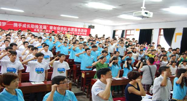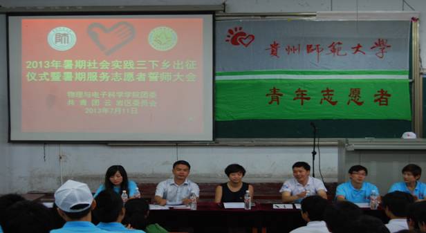 2013年7月11日,必一体育·(中国)官方网站2013年暑期“三下乡”社会实践出征仪式暨暑期服务志愿者誓师大会在物理楼731教室隆重举行。出席大会的领导有:贵阳市云岩区团委书记马晶,贵州电视台第五频道人力资源部经理、迪士尼欢乐博览贵阳站志愿者管理组组长王涛,院党委副书记李应发老师,院团委书记秦欣老师,副书记罗超、吴培老师。此外,还有各年级辅导员老师及所有志愿者共260余人参加了本次大会。