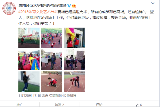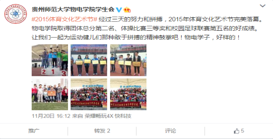 必一体育·(中国)官方网站在花溪校区顺利闭幕的“贵州师范大学2015体育文化艺术节”中喜获佳绩。体育艺术节共历时三天,比赛分为多个项目,经过激烈角逐物电学院团体以荣获团体总分第二名,广播体操比赛获得三等奖,校园足球比赛荣获第五名。