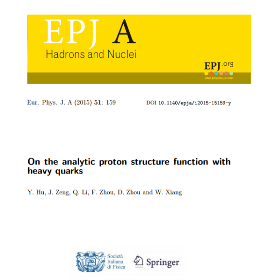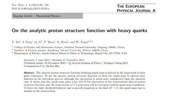 在向文昌研究员的指导下,他们利用量子力学基本原理和计算机模拟研究了质子的微观结构。该研究成功的计算出了夸克和胶子在质子中的分布,极大的推动了人们对微观物质世界的了解。该研究成果《On the analytic proton structure function with heavy quarks》发表在SCI三区期刊 European Physical Journal A (2015 51: 159) 上。该杂志SCI影响因子为:2.736.