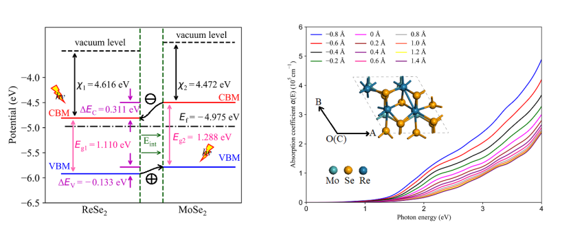 该项工作,通过第一性原理计算软件VASP,首次系统地研究了垂直应力对二维ReSe2/MoSe2 垂直型异质结的光电性质的影响。研究表明,异质结的带隙值能够较好的被垂直应力调控,且II型的带排列性质能够稳定存在,这有利于电子何空穴的有效分离。在研究带排列的过程中,作者独辟蹊径,通过绝对电负性来分析异质结形成前后的带阶,结果与VASP直接计算的投影能带图的结果相差不大,即表明可以用绝对电负性来计算材料的带阶。且在计算过程中考虑周到,不仅考虑了范德华力,而且还考虑了自旋轨道耦合对异质结性质的影响。在带隙计算时还用了HSE06杂化泛函的方法进行了验证。光学性质的研究结果表明,这种异质结具有制备紫外线探测设备的应用前景。