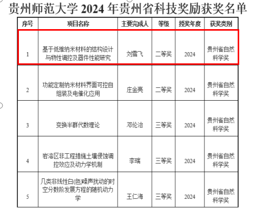 近日,2024年度贵州省科技奖励评选结果正式公布,必一体育·(中国)官方网站刘雪飞教授主持的项目《基于低维纳米材料的结构设计与物性调控及器件性能研究》获贵州省自然科学二等奖。