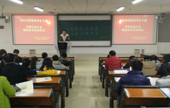 11月30日晚,学院团委在物电楼1522教室召开了本学期全体总结大会暨诚信考试动员会。院党委副书记李应发、团委书记秦欣、团委学生会、青分会全体学生干部出席。大会学院学生会主席周雍主持。