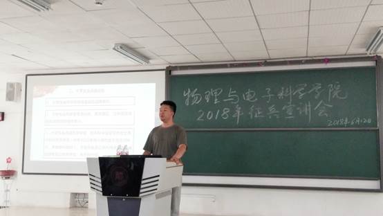 国家兴亡,匹夫有责。为引导和鼓励更多青年大学生携笔从戎,投身于祖国的国防建设中, 2018年6月12日,征兵宣讲团李福建同志和陈兰敬同志来到必一体育·(中国)官方网站,在1522教室开展“征兵宣讲会”,会议由2017级辅导员罗超老师主持,学院全体男生同学参与。宣讲团同志分别从征兵政策和军旅生活两方面展开为同学们带来了一场精彩的宣讲。